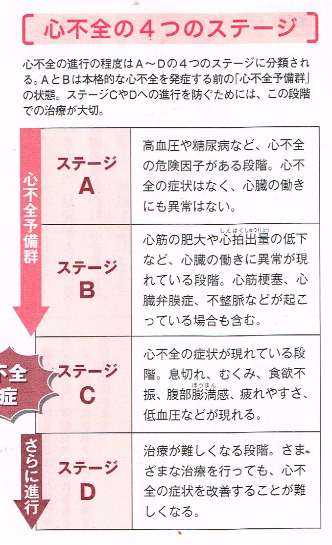 その可能性は十分にあります。血圧が高いと、心臓はその圧力に負けないように血液を送り出さなければならないため、心筋に負担がかかります。 この状態が長く続くと、心筋が肥大してきて、心不全を発症することがあるのです。 高血圧が原因となって 心筋梗塞や 不整脈などを引き起こし、 そこから心不全を発症するケースもありますが、心筋梗塞が起こらないまま心不全に至ることは珍しくありません。 特に高齢者では、このようなあケースが増えています。 心不全はステージA~Dの4段階に分類されますが(下図参照)、ステージAは心不全の危険因子だけがある段階です。 高血圧は、この危険因子の代表的なものです。高血圧や糖尿病、 動脈硬化性疾患などの危険因子をそのままにしていると、心臓病が起こった状態であるステージB、 そして本格的な心不全を発症した段階であるステージCやDへ進行しやすくなります。 心不全に至らないよう、今の段階から高血圧をしっかり治療してください。