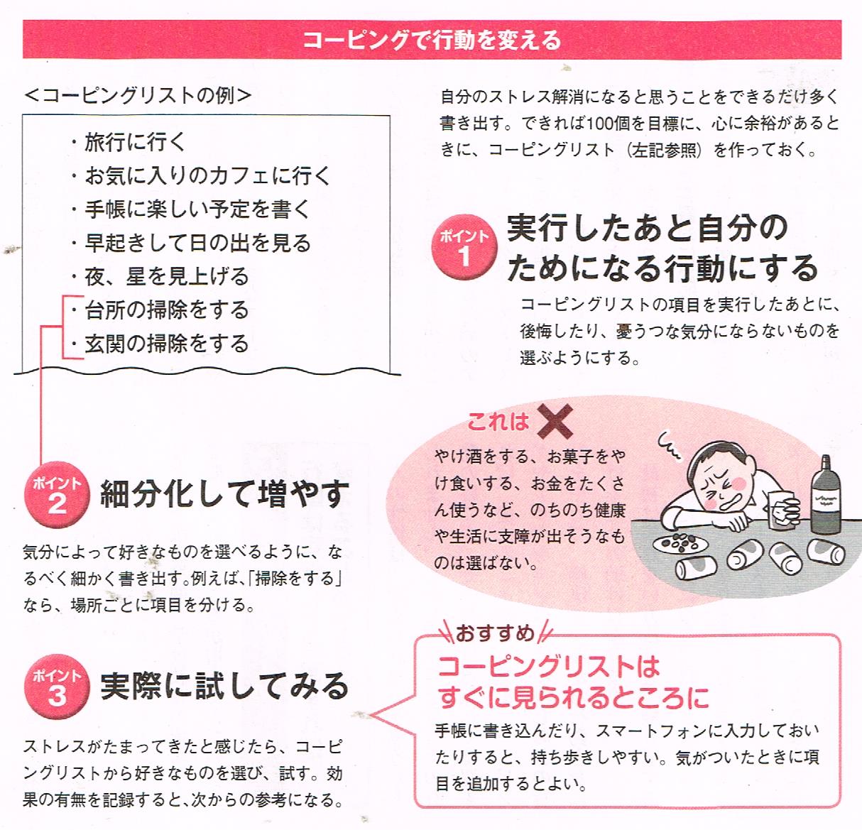 溜まったストレスを前向きに解消するには、「コーピング」という対処法を身に着けることが役立ちます。 コーピングとは、「上手に対処する」という意味の英語で、ストレスの対処法として使われる場合は、 適当な気晴らし、適切なストレス解消法という意味になります。 コーピングのポイントは、自分にとってのストレス解消法の内容を「あらかじめ考えておく」ことです。 ストレスが溜まった状態では、精神的に余裕がなく、何とか対処しようと思っても、なかなか良い方法が思い浮かびません。 そのため、やけ食いなど、その場しのぎの方法を繰り返し、後で落ち込むというパターンに陥ってしまうのです。 そうした状態にならないためにも、元気な時に、自分にとってストレス解消になること、つまり自分のコーピングは何かをあらかじめ考えておくことが大切になります。 できるだけたくさんのコーピングを箇条書きにして、コーピングリストを作っておきましょう。 コーピングを考えるときのコツは、後で後悔しない「自分のためになる行動を選ぶ」ことです。 また、「行動を細分化する」のも項目を増やすコツです。 コーピングは多ければ多いほど、その時の気分や状況にあったものを選ぶことができます。 ストレスが溜まってきたと感じたら、コーピングリストから選んで試してみましょう。 試した結果、効果があったかどうかを記録しておくと、次に選ぶ時の参考になります。